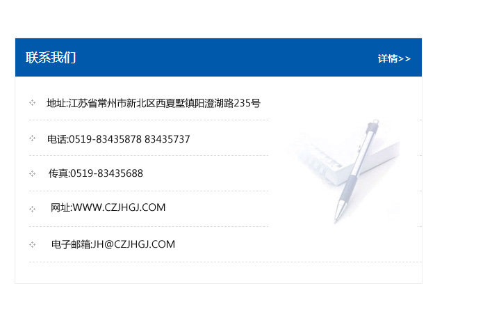 地址:常州市新北區友邦商務大廈1幢16、17層  電話:0519-85101652  傳真:0519-85112595  郵編:213022  網址:www_cz-jiayue_cn.hndhzssj.com  郵箱:xiajifengaa@163.com